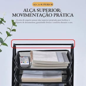 Diferenciais do Produto: Alta Capacidade de Armazenamento - Suporta mais de 800 folhas A4, até 35 livros ou 500 álbuns de desenho Bandejas Deslizantes - Acesso prático e rápido aos documentos Estrutura Triangular Reforçada - Estável e resistente, com fixação por parafusos Acabamento Seguro - Cantos arredondados e polidos para evitar acidentes Alça Superior - Facilita o transporte e a movimentação do organizador