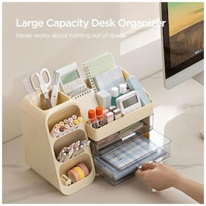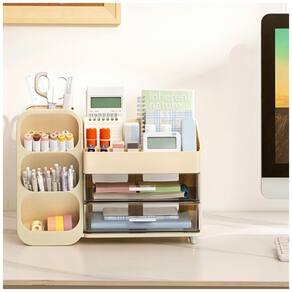 Este organizador de mesa HBlife em plástico ABS bege oferece estrutura única com porta-canetas dedicado, quatro compartimentos superiores e duas gavetas para armazenamento de itens de papelaria e pequenos acessórios. O design foi desenvolvido para uso sobre superfícies de trabalho em escritórios, residências, escolas e estúdios de arte.