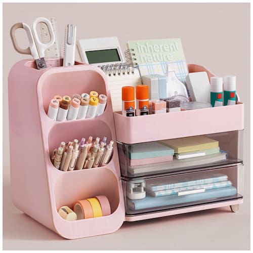 Este organizador de mesa HBlife em plástico ABS rosa oferece estrutura única com porta-canetas dedicado, quatro compartimentos superiores e duas gavetas para armazenamento de itens de papelaria e pequenos acessórios. O design foi desenvolvido para uso sobre superfícies de trabalho em escritórios, residências, escolas e estúdios de arte.