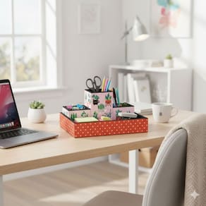 Organizador de mesa em MDF e acabamento interno em material aveludado preto. Contém: uma bandeja medidas: 23 cm (comp.) x 16 cm (larg.) x 4 cm (alt.); 2 porta-clips medidas: 7 cm (comp.) x 7 cm (larg.) x 5,0 cm (alt.) e 1 porta-lápis medidas: 7 cm (comp.) x 7 cm (larg.) x 10 cm (alt.).