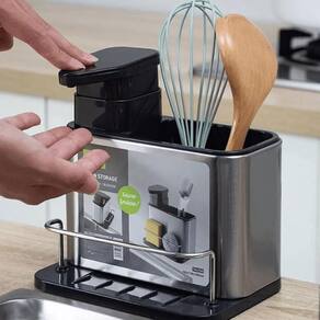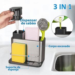 Características Cor: Prata e Preto Material: Aço Inox 430 + Polipropileno Capacidade: 300ml 3 em 1: Dispenser, escorredor e porta esponjas Economiza Espaço Desmontavel Fácil de usar Fácil de limpar Duravel Resistente Organizador