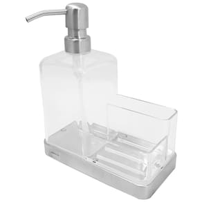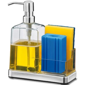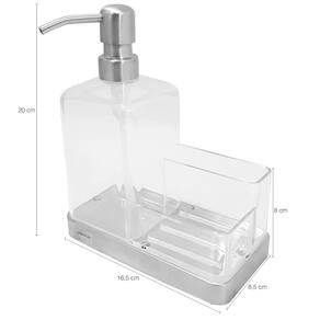 Garantia: 90 dias / Peso: 435g / Cor: Inox e Natural, Azul ou Vermelho. / Ref: 21131 Dimensões: 17cm (C) x 8,5cm (L) x 20cm (A) Suporte para detergente com Bico dosador Cuidados: Não lavar com materiais abrasivos Capacidade: 500ml Comporta: Detergente liquido, Esponja, Sabão em barras.