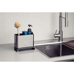 Com um design inteligente e funcional, ele é perfeito para manter sua pia arrumada e seus itens de limpeza sempre ao alcance. Desenvolvido na posição vertical, ele economiza espaço em sua bancada, mantendo tudo organizado de forma eficiente, sem reter umidade, pois sua bandeja de esponja é elevada, seu design é perfurado e conta com bandeja de gotejamento, que ainda permitem o fluxo de ar e facilitam a remoção eficiente da água. O organizar ainda combina materiais de alta qualidade para garantir durabilidade e resistência: a garrafa do sabão líquido é feita em PET, enquanto o corpo do organizador é uma combinação de aço inox, polipropileno e ABS.