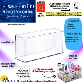 Dimensões e combinações milimétricas: Os tamanhos (comprimento e profundidade) dos organizadores formam um padrão único no mercado porque são produzidos com intervalos de 7,3cm, ou seja, são múltiplos de 7,3cm, o que faz com que formem um nicho perfeito com diferentes espaços de organização em um só lugar, dependendo da sua necessidade. Basta definir o espaço que deseja organizar e escolher o tamanho de cada caixa organizadora para formá-lo. Próprio para organização de objetos de diversos tamanhos.