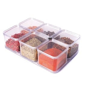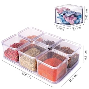 Conjunto de 6 potes quadrados com tampas independentes e 1 base retangular única, produzidos em poliestireno 100% transparente, atóxico e livre de bisfenol-A (BPA Free) em sua composição, o que permite armazenar alimentos com total segurança.