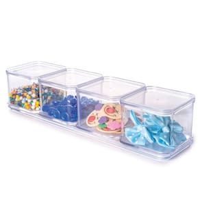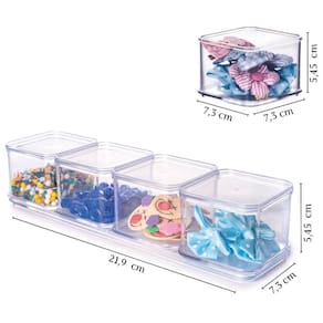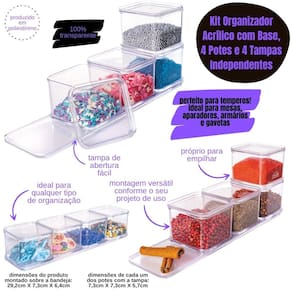 Conjunto de 4 potes quadrados com tampas independentes e 1 base retangular única, produzidos em poliestireno 100% transparente, atóxico e livre de bisfenol-A (BPA Free) em sua composição, o que permite armazenar alimentos com total segurança.