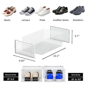 - Feito de material plástico resistente e durável de alta qualidade. Paredes leves de plástico macio e moldura de porta de plástico rígido. Cada compartimento mede aproximadamente 13,1” × 9,5” × 5,7”. Feito para sapatos masculinos de tamanho médio até 8