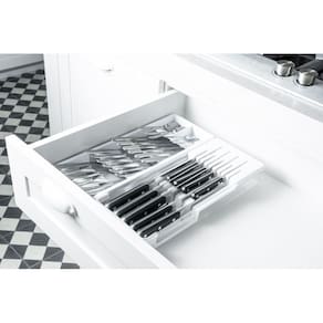 A principal função destes organizador de gaveta é organizar e deixá-los separados, protegidos e limpos, prontos para o uso. Fabricado em polipropileno, material com alta resistência a impactos e ao calor. Sua cozinha linda e Organizada com qualidade e sofisticação.