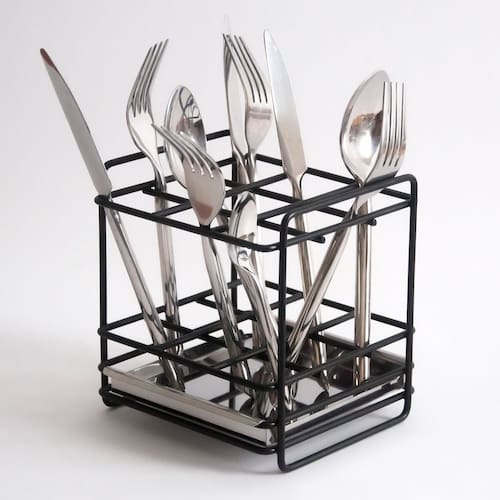Organizador de talheres cód. 2443 Medidas: 140x150x135mm Características: Com divisores fixos para organizar talheres Material: bandeja em inox estrutura em aço carbono Acabamento: pintura preta Insumos que acompanha: 01 bandeja em inox Garantia: 12 Meses