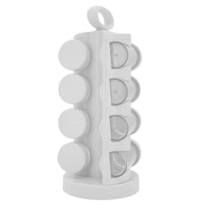 São 8 potes com tampa para tempero que se encaixam no organizador.