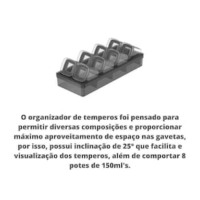 A Linha Clear é a união entre transparência e organização que independente do ambiente, promove um design perfeito para organizar e aumentar o espaço das suas gavetas. O organizador de temperos foi pensado para permitir diversas composições e proporcionar máximo aproveitamento de espaço nas gavetas, por isso, possui inclinação de 25 que facilita e visualização dos temperos, além de comportar 8 potes de 150ml's. Combine, encaixe e enxergue facilmente o conteúdo, mantendo tudo em ordem. Produzido em material resistente Plásticos PP + PS + silicone que proporciona alta transparência, fácil higienização e praticidade na hora de organizar. A linha Clear é indispensável para auxiliar você na organização da sua casa.