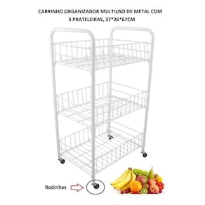 Carrinho organizador multiuso. Pode ser usado na cozinha para frutas, verduras e legumrs. No quarto, sala ou banheiro para organizar tudo que deseja. Muito prático e bonito, ainda acompanha rodinhas para mais conforto para nossos cliente. Medidas 67cm de altura x 37cm de largura x26cm de profundidade Cor: branco Composição: metal Peso 1,4kg Com nota fiscal e garantia de 90 dias
