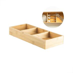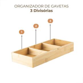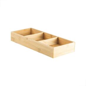 R: O Organizador De Gavetas Cozinha 03 Nichos Bambu Keep possui as seguintes dimensões: altura de 5,6cm, largura de 15cm e profundidade de 38cm.