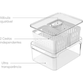 Descrição O Organizador De Geladeira 2,2 Litros Com Tampa Clear Fresh é o novo padrão de transparência na organização da sua geladeira. Empilhe, encaixe e enxergue facilmente os alimentos armazenados na geladeira, mantendo tudo em ordem. Seu design foi pensado para promover frescor prolongado para alimentos como: frutas, legumes, verduras e frios em pedaços, mantendo uma rotina sem desperdícios. Sua bandeja interna de drenagem evita que os alimentos fiquem molhados após a lavagem, ajudando a prevenir a deterioração precoce. Super transparência, beleza e cuidado com o alimento são características da linha Clear Fresh, perfeitas para auxiliar na organização da sua geladeira e facilitar o seu dia a dia.