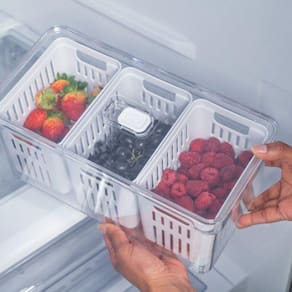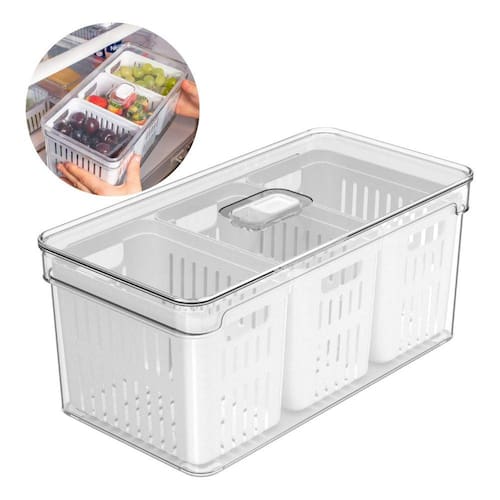 O organizador de geladeira Clear Fresh possui capacidade de 5L e conta com 3 cestos para manter alimentos, frutas e verduras organizados. O sistema de armazenamento evita que as frutas, verduras e alimentos fiquem molhados, desta forma, tendo uma maior durabilidade.