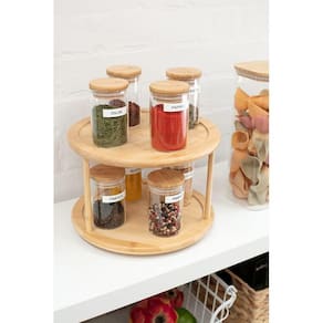 Organizador Giratório de Bambu 2 Andares 26CM Na hora de manter a organização da sua casa conte com o Organizador Giratório de Bambu 2 Andares 26CM. Confeccionada em bambu, material resistente e com agentes bactericidas que previnem o aparecimento de fungos e bactérias, ele é perfeito para você. Possui base giratória e dois andares para você colocar o que quiser. Garanta já o seu.