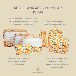 Organizador para mala de viagem kit com 7 peças estampa verão Transforme sua viagem com o organizador de mala 7 peças organização máxima: mantenha suas roupas, acessórios e itens pessoais perfeitamente organizados. Sem mais bagunça na mala Versatilidade total: com 7 peças de tamanhos variados, você pode separar roupas, sapatos, cosméticos e até eletrônicos de maneira prática e eficiente. Material durável: fabricado com materiais de alta qualidade, resistentes à água e ao desgaste, garantindo proteção e durabilidade para suas viagens. Fácil de usar: fechamento com zíperes robustos e alças práticas que facilitam o manuseio e a identificação rápida dos seus itens.