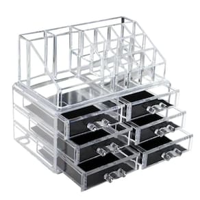 Material: AcrilicoO ChatGPT disse: Organizador De Maquiagem Acrílico com 6 Gavetas e 17 Divisórias para CosméticosEsse lindo porta-maquiagem de acrílico possui 20 divisórias, sendo 16 compartimentos para organizar perfeitamente batons, gloss, bases e outros itens, além de 4 espaços de tamanhos diferentes para guardar lápis, pincéis, cosméticos e acessórios.Destaques do Produto:Organização e Praticidade: Ideal para manter seus itens de beleza bem organizados e de fácil acesso na bancada, penteadeira ou banheiro.Design Versátil: Pode ser utilizado como duas peças separadas para melhor adaptação ao seu espaço.Ideal para Presentear: Perfeito para quem adora maquiagem e produtos de beleza.Gavetas com Pegadores: Acabamento sofisticado e de fácil manuseio.Ampla Capacidade: Possui 6 gavetas e 17 compartimentos para batons e acessórios.Especificações Técnicas:Cor: Transparente.Material: Acrílico.Dimensões: 18 x 22 x 17 cm. Marca: Não Informado
