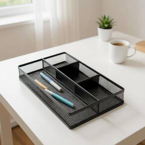Mantenha sua mesa sempre arrumada com o Organizador de Mesa 4 Divisórias. Fabricado em metal resistente e durável, esse organizador é ideal para escritórios, home office ou ambientes de estudo. Seu design moderno com estrutura vazada oferece praticidade e um toque sofisticado ao seu espaço.