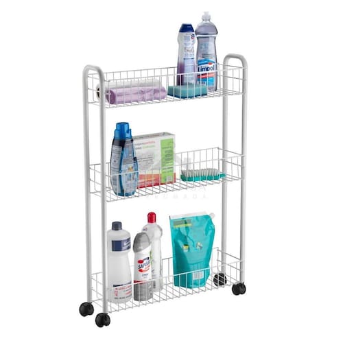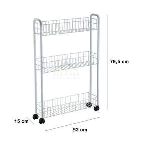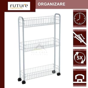 TemSempre um cantinho que precisa de arrumação. Para isso, o Organizador tem 3Prateleiras e pode ser colocado em qualquer ambiente. Discreto, organizeO banheiro, a área de serviço ou a cozinha.Além do tradicional tratamento superficial da Future - onde são aplicadas até 4Camadas de metal - os produtos são revestidos com uma camada extra do protetivoEspecial Rust Free, garantindo cores vivas e brilhantes, além de maiorResistência contra ferrugem. Especificações:Matéria-prima:Aço CarbonoLinha:Organizare Dicas de Uso:-Para limpeza periódica recomenda-se o uso de um pano macio, água e sabãoNeutro.-Nunca utilize materiais abrasivos, lã de aço, esponjas ásperas, solventes ouProdutos químicos corrosivos cloro, água sanitária .