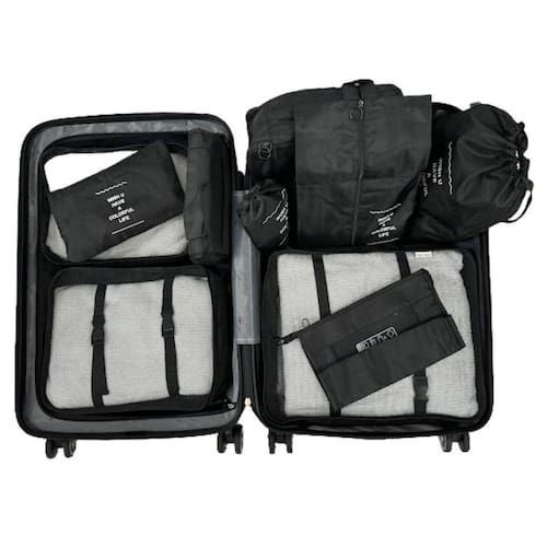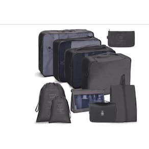 Organizador necessaire para mala de viagem kit 10 peças coleção unique - preto Nosso kit organizador para mala de viagem de 10 peças é a solução perfeita para tornar suas viagens mais tranquilas e livres de estresseé o companheiro perfeito para qualquer viajante que busca praticidade e eficiência.Economia de espaço: com nossos organizadores de mala, você maximiza cada centímetro da sua bagagem. Comprima suas roupas e acessórios de forma eficiente, permitindo que você leve mais itens sem ocupar muito espaço.Organização simplificada: adeus, bagunça nossos organizadores permitem que você classifique e separe suas roupas por categorias. De roupas íntimas a roupas de banho e acessórios, tudo ficará perfeitamente organizado e fácil de encontrar.Livre de rugas e amassados: mantenha suas roupas impecáveis durante toda a viagem. Nossos organizadores evitam que suas roupas fiquem amontoadas na mala, garantindo que você chegue ao seu destino com um visual perfeito.Acesso rápido e prático: não perca tempo procurando por itens perdidos na sua mala. Com nossos organizadores, você terá fácil acesso a tudo o que precisa, seja durante o voo ou ao chegar ao seu destino.Higiene garantida: mantenha suas roupas limpas separadas das sujas. Nossos organizadores permitem que você mantenha a higiene em dia, evitando o contato entre peças sujas e limpas. Marca: Mimos E Viagens
