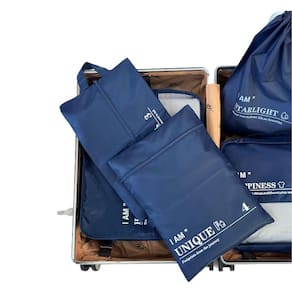 Organizador necessaire para mala de viagem kit 6 peças coleção unique - azul marinho nosso kit organizador para mala de viagem de 6 peças é a solução perfeita para tornar suas viagens mais tranquilas e livres de estresseé o companheiro perfeito para qualquer viajante que busca praticidade e eficiência.Economia de espaço: com nossos organizadores de mala, você maximiza cada centímetro da sua bagagem. Comprima suas roupas e acessórios de forma eficiente, permitindo que você leve mais itens sem ocupar muito espaço.Organização simplificada: adeus, bagunça nossos organizadores permitem que você classifique e separe suas roupas por categorias. De roupas íntimas a roupas de banho e acessórios, tudo ficará perfeitamente organizado e fácil de encontrar.Livre de rugas e amassados: mantenha suas roupas impecáveis durante toda a viagem. Nossos organizadores evitam que suas roupas fiquem amontoadas na mala, garantindo que você chegue ao seu destino com um visual perfeito.Acesso rápido e prático: não perca tempo procurando por itens perdidos na sua mala. Com nossos organizadores, você terá fácil acesso a tudo o que precisa, seja durante o voo ou ao chegar ao seu destino.Higiene garantida: mantenha suas roupas limpas separadas das sujas. Nossos organizadores permitem que você mantenha a higiene em dia, evitando o contato entre peças sujas e limpasTamanho: Cubo 5: 40x32cm Cubo 6: 34x28cm Necessaire 4: 38x26cm Necessaire 3: 38x23cm Sacos 2: 40x30cmMaterial: poliéster e plástico . Marca: Mimos E Viagens