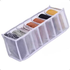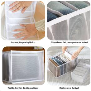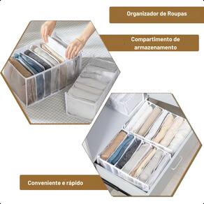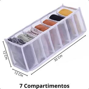 Cor: Branco - 7 COMPARTIMENTOS Organize suas roupas com praticidade e eficiência com o nosso Organizador de Roupas de Alta Qualidade. Feito com materiais premium, como TNT80 nas costuras e divisórias de tela, este organizador oferece uma solução durável e ventilada para guardar suas peças, mantendo-as livres de mofos e odores desagradáveis. Nosso organizador de roupas foi projetado para oferecer não apenas organização, mas também proteção às suas roupas. As costuras em TNT80 garantem uma estrutura resistente e duradoura, enquanto as divisórias de tela proporcionam excelente ventilação. Essa combinação é perfeita para evitar a proliferação de fungos, garantindo que suas roupas permaneçam frescas e livres de odores por muito mais tempo. Este organizador é ideal para guardar uma variedade de peças de roupas, como camisetas, meias, roupas íntimas e até acessórios. Com 7 compartimentos, você pode separar e categorizar suas roupas de forma prática, facilitando na hora de encontrar o que precisa. Além disso, o design compacto permite que ele seja facilmente armazenado em gavetas, prateleiras ou closets, otimizando o espaço disponível. A transparência das divisórias em tela também permite que você visualize rapidamente o conteúdo de cada compartimento, economizando tempo na hora de se vestir. Ficha Técnica: - Material Principal: Costura em TNT80 de alta resistência - Material das Divisórias: Tela transparente para ventilação - Quantidade de Compartimentos: 7 - Dimensões do Produto: 32 cm (comprimento) x 12 cm (largura) x 12 cm (altura) - Peso: Leve e portátil, ideal para uso diário - Usos Sugeridos: Organização de meias, roupas íntimas, acessórios, entre outros - Vantagens: Resistente, ventilado, evita mofo e odores, otimiza o espaço, fácil de limpar, durável - Limpeza: Lavável, fácil de higienizar e manter - Cor:Branco
