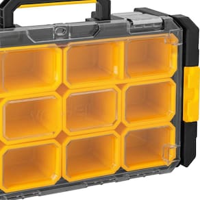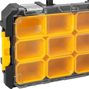 Este modelo conta com 12 compartimentos internos removíveis, sendo que 2 deles possuem divisórias internas também removíveis, permitindo personalizar o espaço conforme os tipos de itens armazenados. Isso oferece mais liberdade para acomodar desde pequenos parafusos até peças maiores com total segurança.