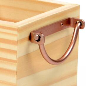 - Fabricado em Madeira Pinus - Possui 3 Divisórias - Possui um charmoso desenho lateral em forma de Zig Zag - Possui 2 alças em Ferro - Medidas: 10x18x10cm AXLXC - Muito Charme