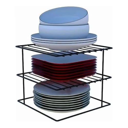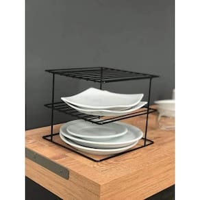 Para otimizar o espaço nas prateleiras e evitar que os pratos quebrem, temos duas opções para organizar melhor seu armário. A opção na vertical é ótima porque podemos acomodar qualquer formato de prato, tanto redondo, quanto quadrado e oval. Já o suporte pequeno podemos aproveitar para empilhar em três níveis, você pode empilhar sobremesa, de jantar e o prato fundo. O organizador de armário de cozinha aramado é ideal para proporcionar organização no armário e manter as louças em segurança, bem como otimizar o espaço, pois cria uma prateleira que permite o armazenamento produtos em lugares antes não ocupados.