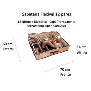 Organizadora de Sapato Chinelo Sandália Tênis 48 Pares com Capa - 4 Unidades de 12 Pares Essa sapateira é um ótimo organizador de Sapatos, Chinelos, Sandálias, Tênis, Sapatênis, dentre outros. Pode ser guardado debaixo da cama e também no guarda- roupa. A cor Marfim, tem capa transparente, facilitando a visualização das peças. As medidas de cada sapateira flexível organizadora são: 14 cm Altura x 60 cm Largura x 70 cm Comprimento . A capacidade de cada sapateira é de 12 pares. Essa Sapateira Flexível é o jeito mais fácil, prático e moderno para você guardar seus Sapatos, Chinelos, Sandálias, Tênis, Sapatênis, dentre outros, sem perder tempo. Ela guarda, protege, tem capa e otimiza os espaços. Feito com PVC e TNT reforçado, é um produto de excelente qualidade e durabilidade. Produto flexível e resistente. Ela possui fechamento em zíper, protegendo os seus sapatos e aumentando a durabilidade deles. Dica: Organize os pares em cada nicho, limpos. Para melhorar a organização, separe seus calçados por categorias: tipo, cor, ocasião de uso, marca, a fim de facilitar o seu dia a dia. A Sapateira Flexível 12 pares pode ser guardada no chão, debaixo da cama, no guarda-roupa ou na cômoda. Se desejar, coloque uma sapateira sobre a outra para ganhar mais espaço. Organize-se e ganhe mais praticidade em sua vida Características e Benefícios: - Marca: VB Home - Tamanho: 60 x 70 x 14 - Cores: Marfim - Material: PVC e TNT - Capacidade: 12 Divisórias em cada Sapateira - Material Resistente e Reforçado - Capa Transparente, o que facilita a visualização das peças - Prático e Compacto, utilize na sua casa ou para viagens - Organiza seus calçados de forma fácil - Otimiza espaço e tempo - Fechamento com Zíper Embalagem: 4 Un Sapateira Esse Kit vem quantas unidades R.: Esse Anúncio é de 4 Unidades do Organizador, caso queira mais, temos Kit's com 1, 2, ou 4 Unidades. Envie mensagem no campo de Perguntas que direcionamos o anúncio ideal para você. O Produto é Novo ou Utilizado Conheça a linha de colmeias organizadoras de gavetas, perfeitas para maior organização de seu armário e closets. Temos organizadores de vários tamanhos, na dúvida consulte-nos. Estamos à sua disposição Sapateira Organizadora Flexível Pares Gaveta Guarda Roupa Armário Closet Cômoda Rack Quarto Sapatos Tênis Sapatênis Social Salto Chinelo Calçados Otimizar Espaço Personal Organizer