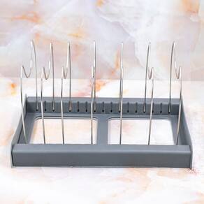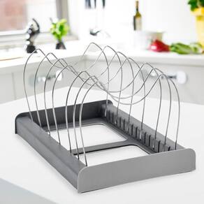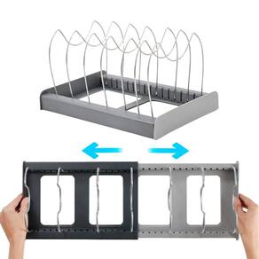 Organize com facilidade: Armazene facilmente tampas de panelas, travessas, formas e outros acessórios, eliminando a bagunça. Comprimento ajustável: Expanda de 30cm para 56cm para acomodar diferentes tamanhos de itens. Apoios em aço inoxidável: Aberturas ajustáveis acomodam uma variedade de tamanhos. Plástico resistente: Durável e fácil de limpar. Design elegante: Complementa qualquer decoração de cozinha.