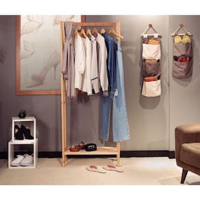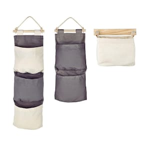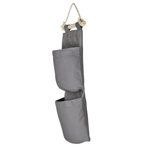 1. Corda de sisal para pendurar. 2. Lona 100% algodão na cor cinza. 3. Pode ser guardado dobrado. 4. Não impermeável. 5. Capacidade 2 kg por bolsa.