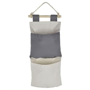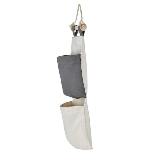 1. Corda de sisal para pendurar. 2. Lona 100% algodão na cor natural e cinza. 3. Pode ser guardado dobrado. 4. Não impermeável. 5. Capacidade 2 kg por bolsa.