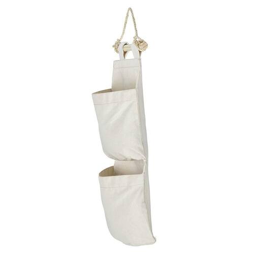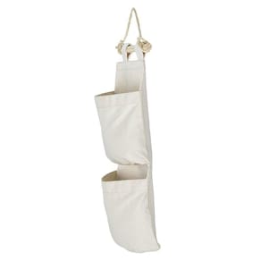1. Corda de sisal para pendurar. 2. Lona 100% algodão na cor natural. 3. Pode ser guardado dobrado. 4. Não impermeável. 5. Capacidade 2 kg por bolsa.