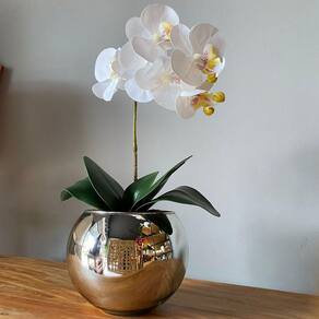 Arranjo permanente de Orquídea em efeito hiper-realista com vaso espelhado.