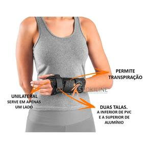 - Possui 2 talas não removíveis, a superior em alumínio e inferior em PVC, com ângulo de 45º. Além disso, possui ajuste com fecho aderente no polegar. A tira do meio é em elástico com três fechos aderentes e fica posicionada bem em cima da articulação, reforçando a imobilização.