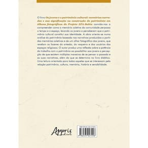 O livro Os jovens e o patrimônio cultural: memórias narradas e sua significação na construção do patrimônio em álbuns fotográficos do Projeto EPA-Bahia convida-nos a compreender como a memória coletiva da comunidade perpassa o tempo e o espaço, levando os jovens a perceberem que o patrimônio cultural constitui sua identidade. A obra orienta-se numa análise do patrimônio baseada nas narrativas produzidas a partir das memórias coletivas e de um olhar fotográfico dos jovens, que revelam os fazeres do artesão, do vaqueiro e dos usuários dos espaços religiosos. O autor produz uma reflexão sobre a potência do trabalho com o patrimônio ao possibilitar aos jovens a percepção de que existem múltiplas maneiras de se pensar o passado e as suas narrativas, além do que se determina no livro didático. Uma leitura orientada para todos aqueles que se interessam pela relação patrimônio, cultura, memória, história e sensibilidade. Ean: 9786525027296