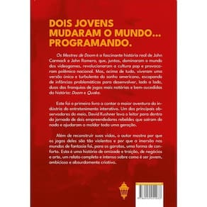 Dois jovens mudaram o mundo... programando Os Mestres de Doom é a fascinante história real de John Carmack e John Romero, que, juntos, dominaram o mundo dos videogames, revolucionaram a cultura pop e provocaram polêmica nacional. Mas, acima de tudo, viveram uma versão única e turbulenta do sonho americano, escapando de infâncias problemáticas para desenvolver, lado a lado, duas das franquias de jogos mais notórias e bem-sucedidas da história: Doom e Quake. Este foi o primeiro livro a contar a maior aventura da indústria do entretenimento interativo. Um dos principais observadores do meio, David Kushner leva o leitor para dentro da jornada de dois empreendedores rebeldes que saíram do nada e ajudaram a moldar toda uma geração. Além de reconstruir suas vidas, o autor mostra por que os jogos deles são tão violentos e por que a imersão nos mundos de fantasia foi, para os garotos, uma forma de conforto. Esta é uma história de amizade e traição, de negócios e arte, um relato completo e intenso sobre como é ser jovem, ambicioso e absurdamente criativo. Traduzido por Felipe Damorim Marca: Não Informado