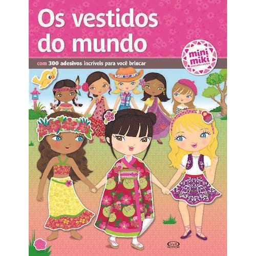 A coleção MINIMIKI apresenta às crianças culturas de diferentes países. A linha “Os vestidos” é bilíngue, ensina curiosidades sobre o país de origem das personagens e acompanha 300 adesivos diferentes. Neste livro as crianças podem vestir bonecas de diferentes países com as roupinhas mais lindas. Poderão observar a Torre Eiffel na França, conhecer o templo da Sagrada Família na Espanha, visitar a Estátua da Liberdade nos Estados Unidos, conhecer a dança do Taiti, se encantar com o Taj mAhal na Índia, celebrar o Natal na Rússia, apreciar um lindo jardim no Japão. E muito mais. É só escolher os adesivos e colar nas personagens.