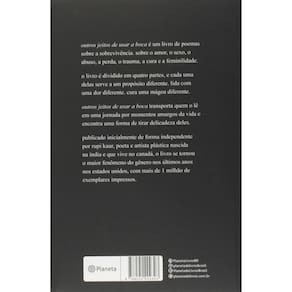 Título do livro : Outros jeitos de usar a boca Autor : Kaur, Rupi Idioma : Português Editora do livro : Editora Planeta do Brasil Ltda. Capa do livro : Mole Ano de publicação : 2017 Quantidade de páginas : 208 Altura : 208 mm Largura : 140 mm Peso : 240 g Com páginas para colorir : Não Com realidade aumentada : Não Gênero do livro : Literatura e ficção Subgêneros do livro : Erotica, abuso, Amor, Imigração, livro feminista, trauma Tipo de narração : Conto Idade mínima recomendada : 18 anos Data de publicação : 01-02-2017