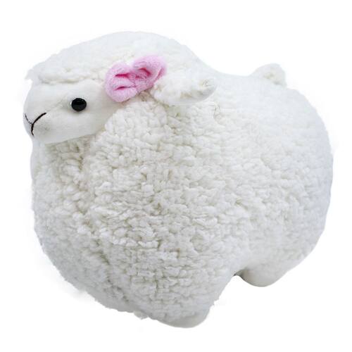 Ovelha de pelúcia com 27cm de altura e laço rosa na orelha. Material: poliéster; Enchimento: fibra de poliéster; Produto certificado por Órgão acreditado pela CGCRE do INMETRO