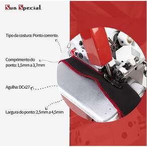 Tipo da costura: Ponto corrente Comprimento do ponto: 1,5mm a 3,7mm Largura do ponto: 2,5mm a 4,5mm Agulha: DCx27 Velocidade máxima: 1.350ppm Motor acoplado ao cabeçote Potência Motor: 180W Tensão: 127V