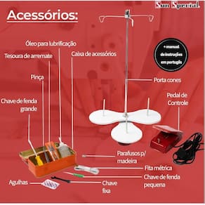 Acompanha acessórios: - Caixa de acessórios - Chave de fenda Grande - Chave de fenda Pequena - Pinça - Óleo para lubrificação - Chave fixa - Agulhas - Porta Cones - Fita métrica - Tesoura de arremate - Parafusos de madeira para fixação - Pedal de Controle - Manual de instruções em portugues.