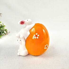 Ovo De Páscoa Porcelana 2 Coelho 9x7cm Decoração Páscoa Ovo de Porcelana Laranja com Dois Coelhos - Decoração Sofisticada para Páscoa