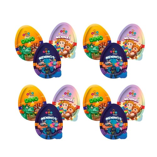 Ovo Toys Surpresa Misto: Cada Display possui 4 unidades do Ovo Toys Meninas - 4 unidades do Ovo Toys Meninos - 4 unidades do Ovo toys Dino, Cada ovo contém um bombom Royal choco e um mini colecionável. Com a combinação perfeita de sabor e emoção.
