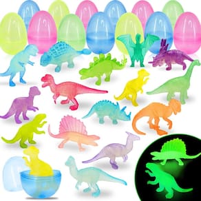 - Ovos de Páscoa cheios de dinossauro: pacote com 36 ovos de Páscoa luminosos cheios de brinquedos de dinossauros. Cada ovo de Páscoa que brilha no escuro mede 5,8 x 4 cm, vem com 4 cores, azul, rosa, verde e amarelo, 9 peças de cada cor. O tamanho dos brinquedos de dinossauro é de cerca de 5,5 x 4,6 cm