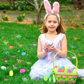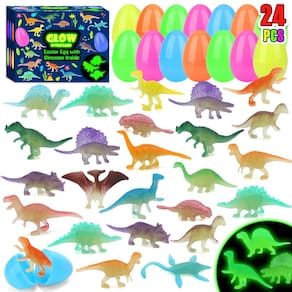 - Cesta de Páscoa: Existem 24 ovos de Páscoa em 5 cores e preenchidos com mini bonecos de dinossauro que brilham no escuro, perfeitos como ovos surpresa para caça aos ovos de Páscoa, as crianças vão se divertir muito ao receber um dinossauro para cada ovo que abrirem.