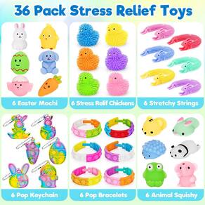- Pacote de Páscoa Super Values: 36 pacotes de ovos de páscoa de 6 cm com 36 brinquedos variados diferentes. Inclui 6 galinhas para alívio de desconforto, 6 pulseiras pop, 6 pop fidgets, 6 mochi de páscoa, 6 mochi de animais e 6 cordas elásticas de coelho. Você não precisa passar horas enchendo ovos. Economize seu tempo!