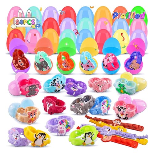 - Ovos de Páscoa cheios de brinquedos fidget de animais: estes ovos de Páscoa pré-cheios contêm 24 peças de brinquedos fidget de animais que podem ser utilizados na mão, existem 12 estilos diferentes de animais, cada estilo de animal tem duas cores diferentes! Inclui coelhos, unicórnios, filhotes, coalas e muito mais!